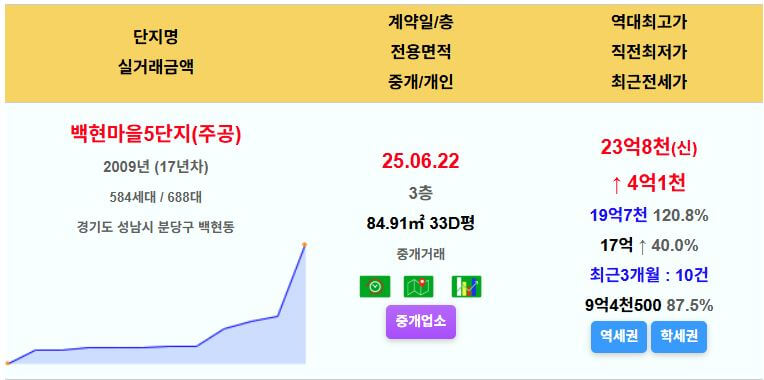 분당 지역에선 백현마을5단지(주공) 33평이 23.8억 신고가를 기록했고, 판교알파리움2단지는 무려 54평 32.5억으로 신고가를 찍었어요. 과거 15억 선이던 백현마을도 이제는 20억 중반을 넘기고 있네요.