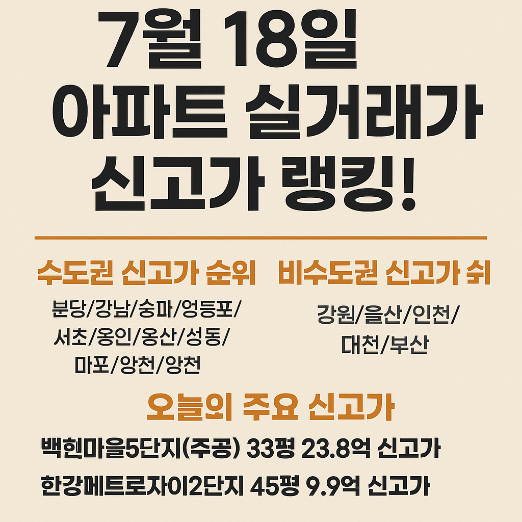 7월 18일 아파트 실거래가 신고가 랭킹! 백현마을·강남현대6차 얼마까지 올랐나?